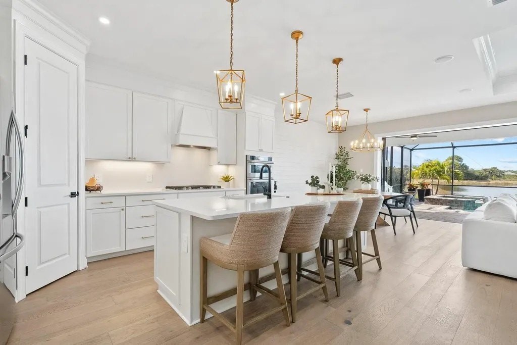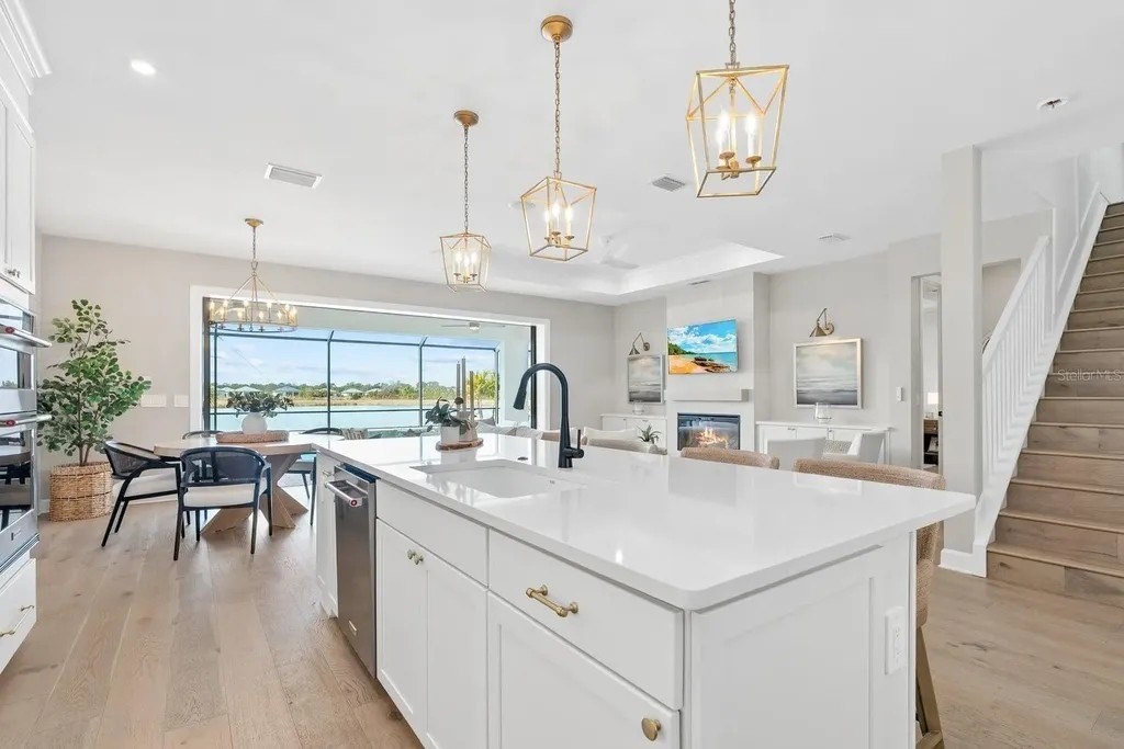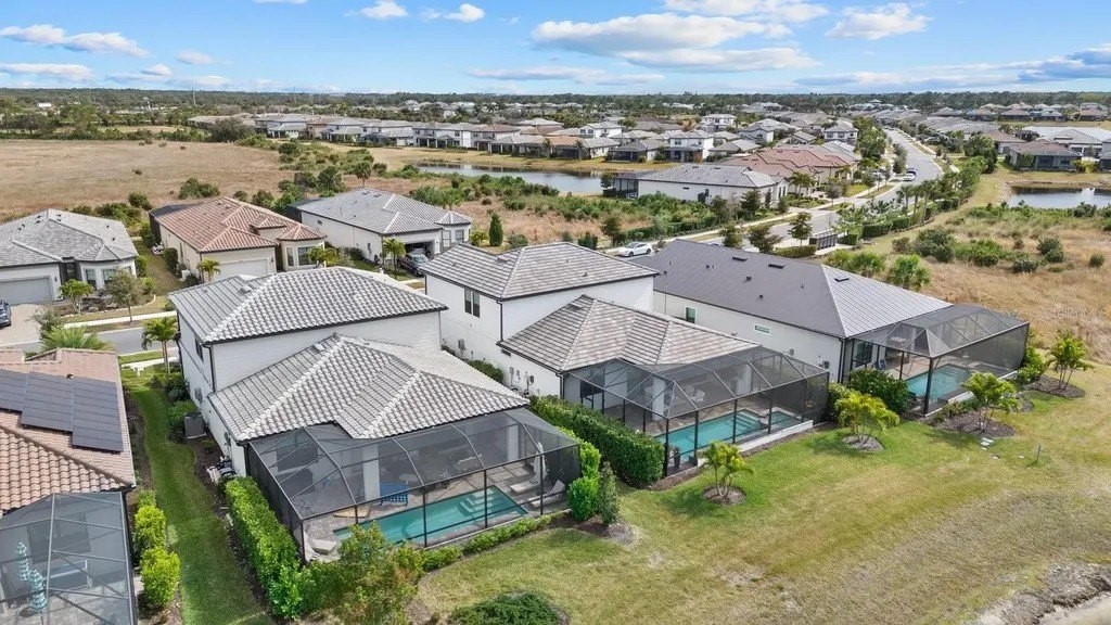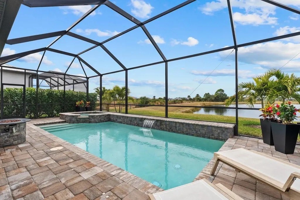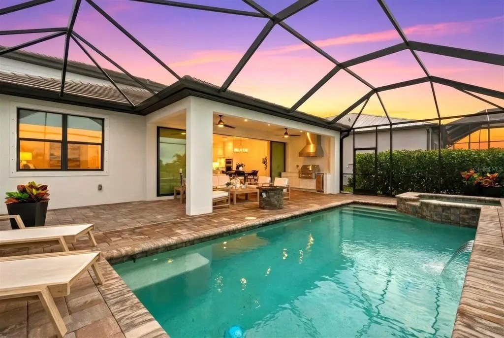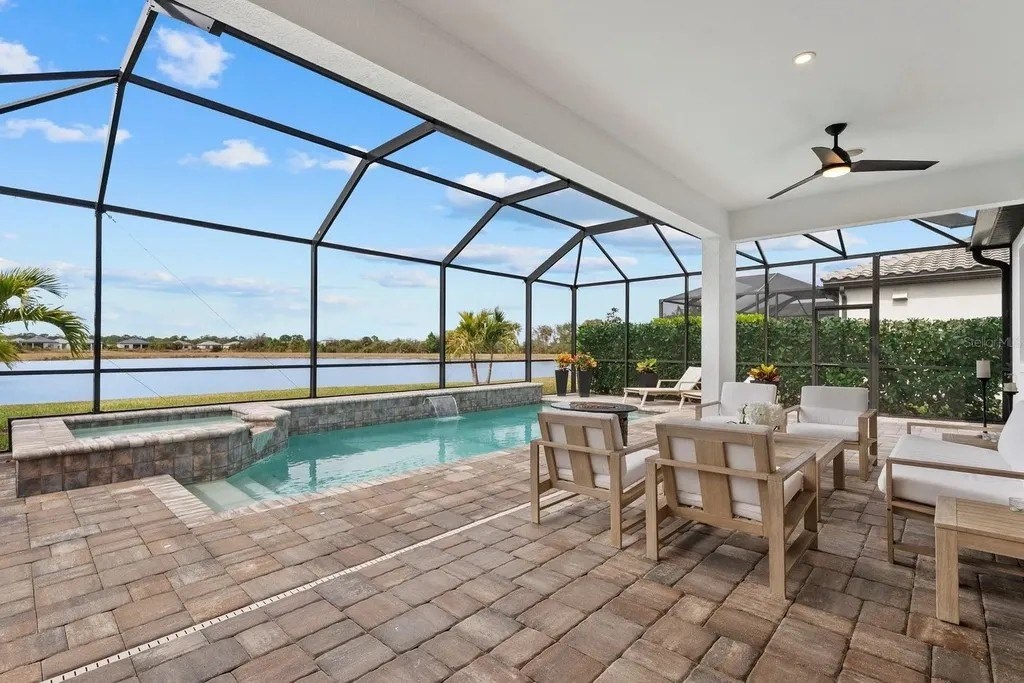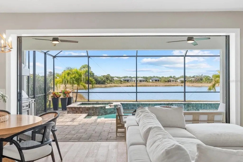 Perfectly positioned on one of the most coveted premium waterfront lots within the resort-style gated community of Talon Preserve, this exceptional 4-bedroom, 3.5 bath residence features an office/den and a bonus room, offering 2,894 square feet and built in 2023 by the highly sought after builder Divosta. With NO CDD FEES and NOT located in a FLOOD ZONE, this home provides piece of mind for the discerning buyer. The sellers spared no expense upgrading this masterpiece with a $135,000 lot premium, 8-foot interior doors, energy efficient tankless water heater, designer lighting fixtures throughout, luxurious engineered hardwood floors with a sound barrier insulation beneath the upstairs flooring, tray ceilings with recessed lighting, designer ceiling fans, custom artisan woodwork, refined shiplap, two electric fireplaces, and all closets have custom built-in shelving. The chef's kitchen is beautifully appointed with stunning quartz countertops and backsplash, 42-inch soft-close cabinetry, designer restoration hardware, double roll-out trays, under-cabinet lighting, a gas cooktop, built-in oven, and microwave/convection oven, and an oversized pantry with custom built shelving. Impress your guests with seamless indoor-outdoor living through pocket sliding glass doors that open to your private backyard oasis, featuring a custom-built heated saltwater pool and spa, along with a fully equipped outdoor kitchen- all set against a long, unobstructed water and preserve view, creating the perfect backdrop for breathtaking sunsets. The custom-built outdoor kitchen includes a sink, refrigerator, built-in gas grill, and a custom Tradewind hood properly vented through the roof for optimal ventilation. The primary suite is located on the first floor and features an oversized walk-in closet and en-suite bathroom with dual sinks, walk-in shower, and sunken tub. Upstairs you will find 3 additional bedrooms along with an oversized bonus room that features a custom built-in desk, fridge, and electric fireplace. Two of the bedrooms share one full size bathroom, while the fourth bedroom serves as a second primary suite, complete with its own en-suite bathroom. The oversized garage features an epoxy floor finish, a 4-foot extension, and an EV charger that conveys only upon request. A holiday package that has additional elevated exterior outlets for adding lights around the home. Technology and security are thoughtfully integrated with a Sonos sound system featuring six hardwired in-ceiling speakers powered by three amplifiers, and a hardwired smart security system with multiple cameras and high-tech features. A complete list of upgrades is available upon request. Residents of Talon Preserve enjoy resort-style amenities including an 18,000 sq. ft. grand clubhouse, an active social calendar with events, resort-style pool, hot tub, fire pit, state of the art fitness center, arcade, poolside bar & grill, pickleball, tennis, dog park, bocce courts, playground, landscaping and irrigation are included in the quarterly HOA fee. Located in an A-rated school district and just minutes to Nokomis beach, premium restaurants, and Sarasota Memorial Hospital-Venice. This is a rare opportunity to own a premium waterfront lot so act quickly and call for your private showing today. Search the address on YouTube for a full video tour.